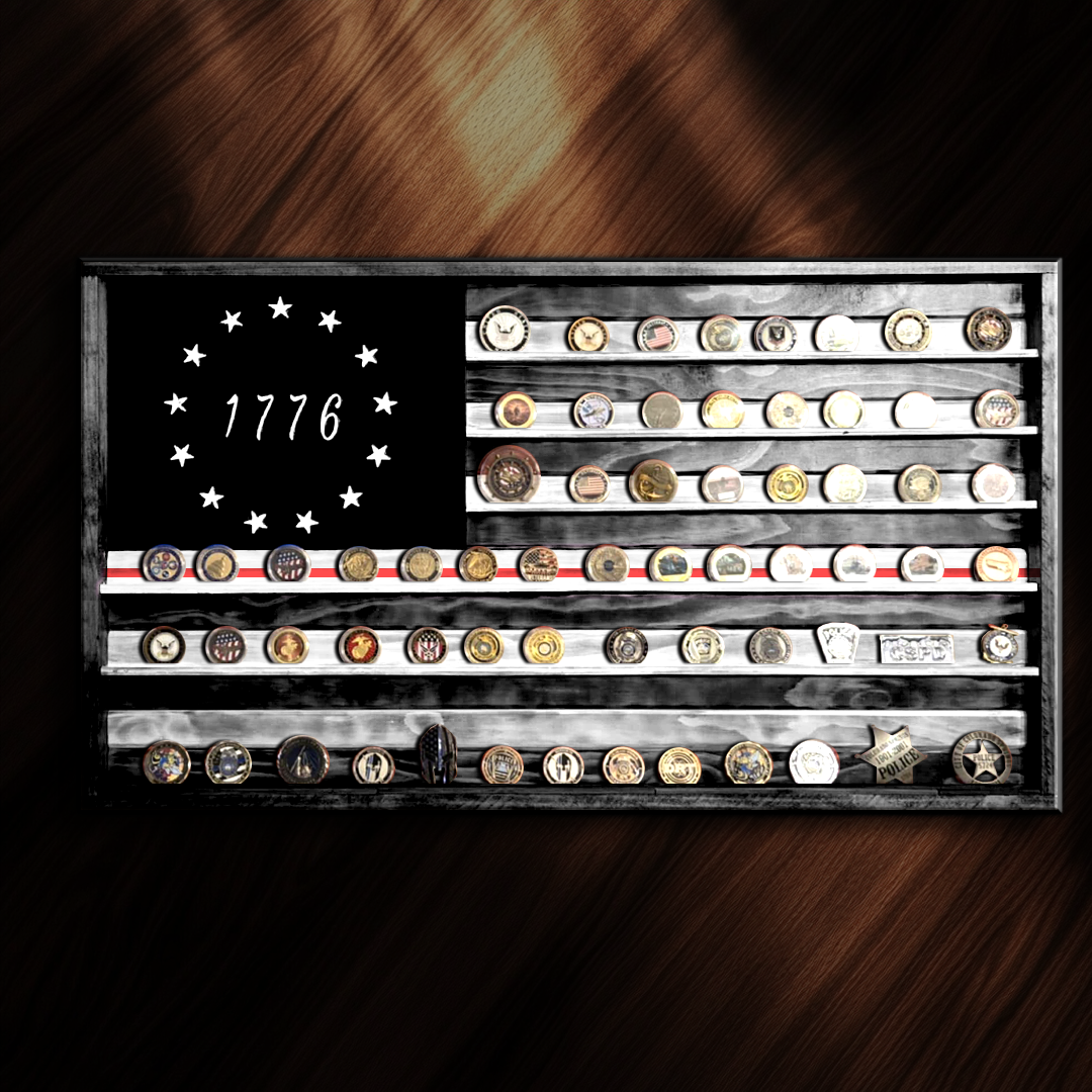For a personal touch, both the Large and Medium flags can be customized with an optional small shelf, featuring a groove beneath each white stripe. Perfect for displaying your challenge coins, badges, or other treasured items. Add the coin shelf for just an additional $20.